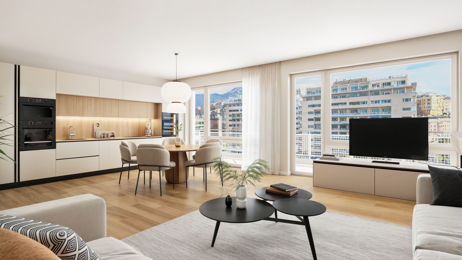 Il progetto prevede un ingresso su ampio salone open space con cucina a vista, affacciato su una balconata panoramica con vista aperta sul mare e sul Monte di Portofino, accessibile da tutti i locali e capace di garantire grande luminosità.