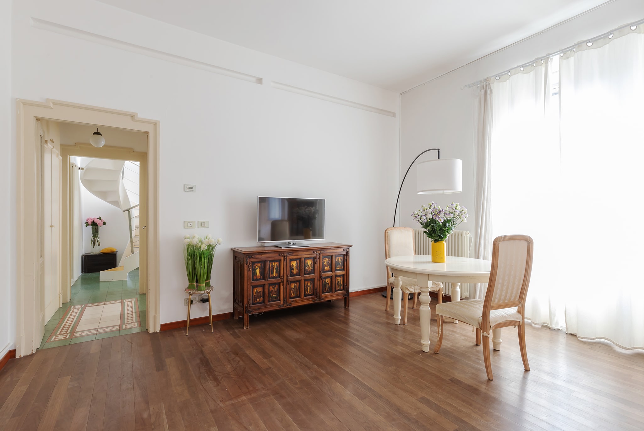 Al primo livello un ampio soggiorno con balcone, una camera / studio con due porte a scomparsa in legno e vetro, una accogliente cucina abitabile, un bagno. Nella zona giorno rivestimenti in parquet naturale.