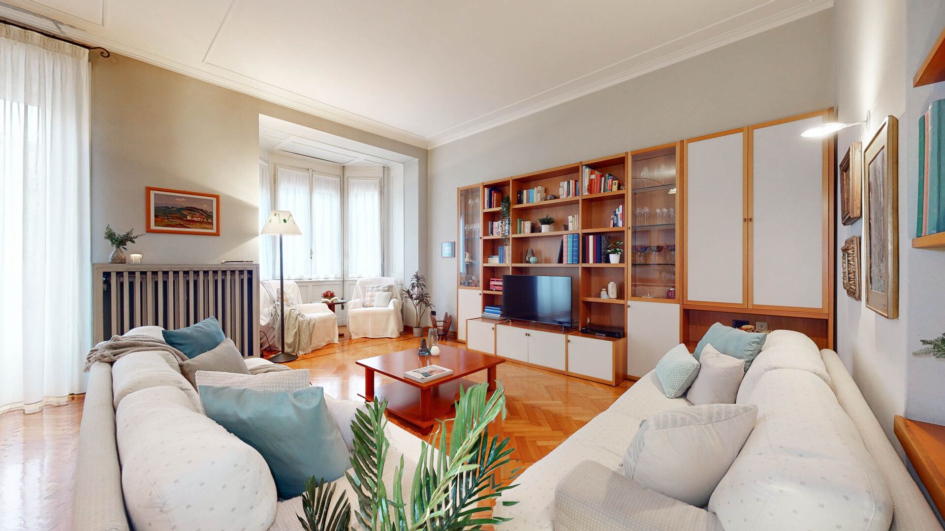 L’ingresso si apre su ambienti ampi e luminosi, pensati per una quotidianità comoda e rappresentativa. Il soggiorno doppio, con balcone, è uno spazio arioso, ideale per ricevere o semplicemente vivere momenti di quiete in un’atmosfera raffinata. La cucina, di dimensioni generose, è un ambiente a sé stante con balcone: perfetta per chi ama convivio, preparazioni importanti o semplicemente la qualità degli spazi ben organizzati.