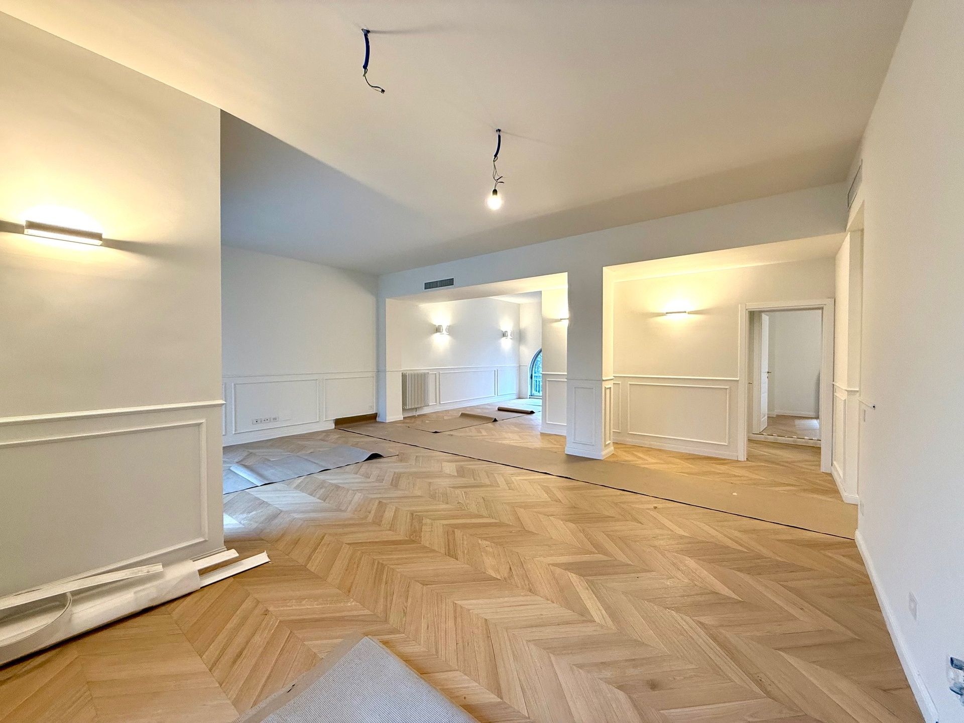 MM1 Conciliazione - via Ariosto / Alberto da Giussano: vibrante incrocio dei quartieri più eleganti ed ambiti della città, Porta Vercellina / Magenta / Pagano, in posizione privilegiata, con ogni tipo di servizio, proponiamo in vendita: Appartamento di ca. 175mq interni con ca. 50mq di terrazzo, sito al 1 (primo) piano di un bellissimo Palazzo d’Epoca con ingresso in marmo e portineria, completamente ristrutturato con materiali di pregio e così composto: ingresso, soggiorno con cucina a vista e sala da pranzo, camera matrimoniale con bagno en-suite e cabina armadio, due camere matrimoniali servite dal secondo bagno, una camera singola / studio / servizio con zona lavanderia e bagno degli ospiti, il tutto corredato da un grande terrazzo di 14x3,5m affacciato su uno splendido giardino con piante secolari. Gli interni, completamente ristrutturati a nuovo e mai abitati, presentano finiture di alto livello e soffitti alti 3,20 metri, che donano grande luminosità ed una piacevole sensazione di ampiezza. La proprietà è dotata di riscaldamento centralizzato, aria condizionata canalizzata, parquet di pregio posato a spina di pesce, nuovi infissi ad alta prestazione termica ed acustica, e bagni meravigliosamente rifiniti. Completano la soluzione due cantine e la possibilità di acquistare un box auto all’interno dello stabile.