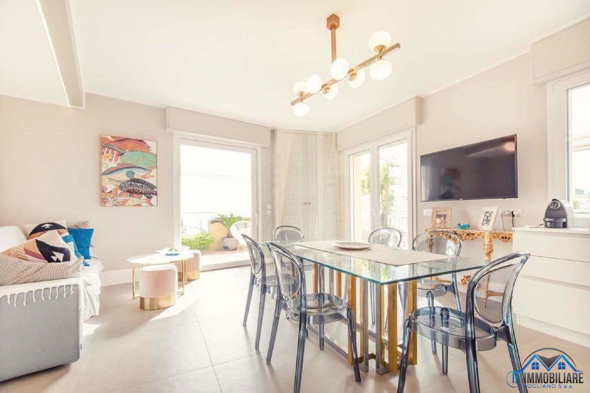 DESCRIZIONE: ingresso nell'ampio soggiorno/living con angolo cottura dal quale si accede al terrazzo attrezzato con doccia e con stupenda vista mare, 3 camere spaziose, 2 bagni di cui 1 privato ed 1 di servizio.