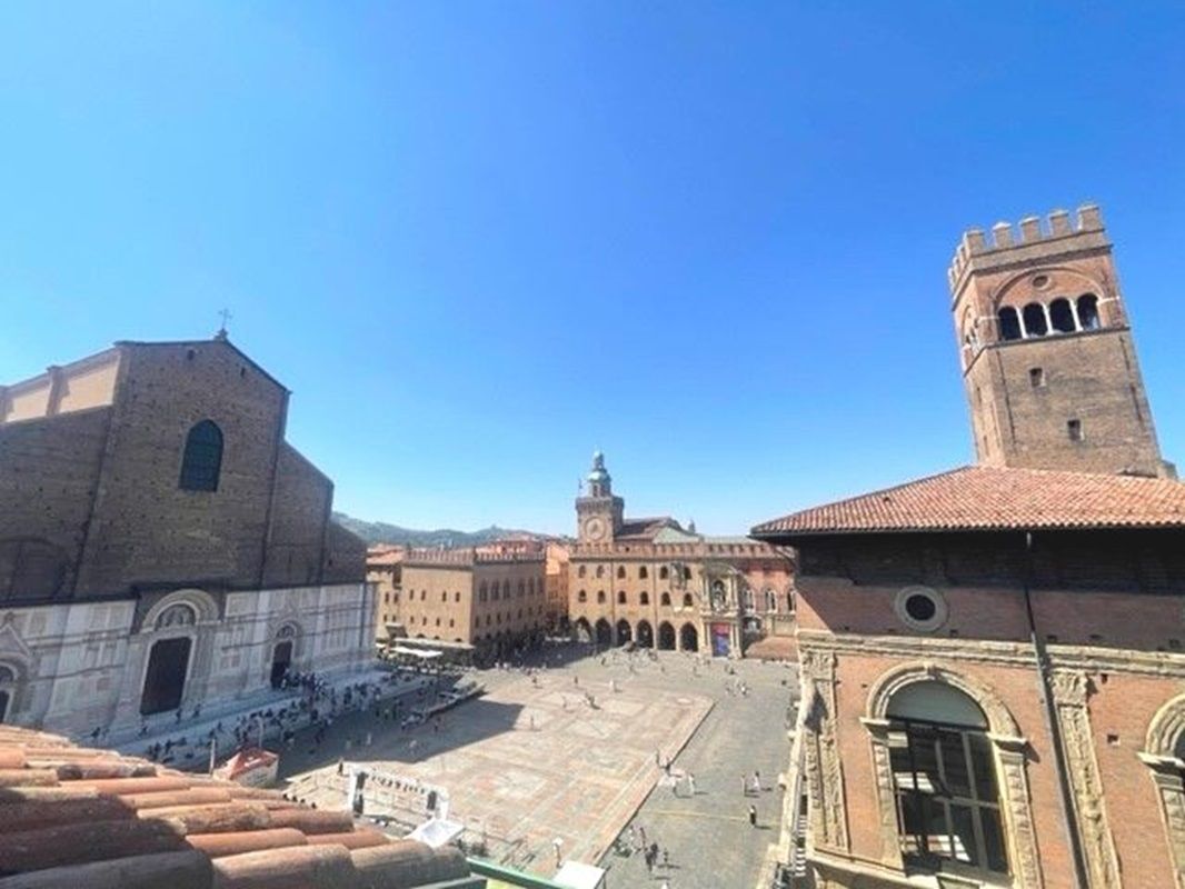 Splendido attico sui tetti di Bologna di circa 145 mq e terrazza abitabile di 16 mq con ampio soggiorno dal doppio affaccio e vista mozzafiato su Piazza Maggiore, San Petronio, le Due Torri e i tetti della città.