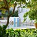 Giardino con piscina privata, vani tecnici, e vista sulla marina e sul borgo medioevale.