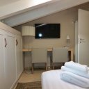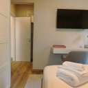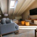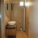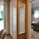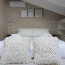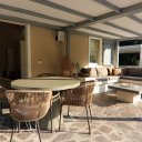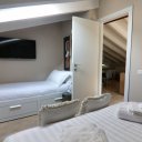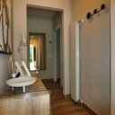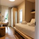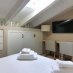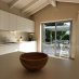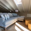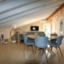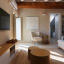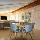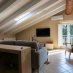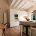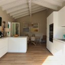 La villa dispone inoltre di un primo piano indipendente, un appartamento a sé tutto con tetto a vista, con zona giorno, angolo cottura, una camera matrimoniale, una camera con tre posti letto e un bagno. Questa zona si è rivelata perfetta per i nonni, che hanno potuto godere della propria privacy pur restando vicini.