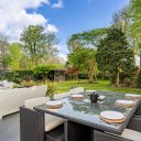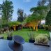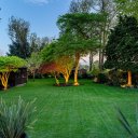 Un grande tavolo da caffè con fossa antincendio a gas e illuminazione esterna circondano l´intera periferia e gli alberi dell´area del giardino di 160 piedi.