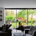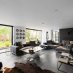 Porte scorrevoli in alluminio a tutta altezza, tende elettriche telecomandate, TV a incasso, caminetto a gas Italkero Venezia a doppia facciata in vetro e un ufficio sono tutte caratteristiche di questa stanza.