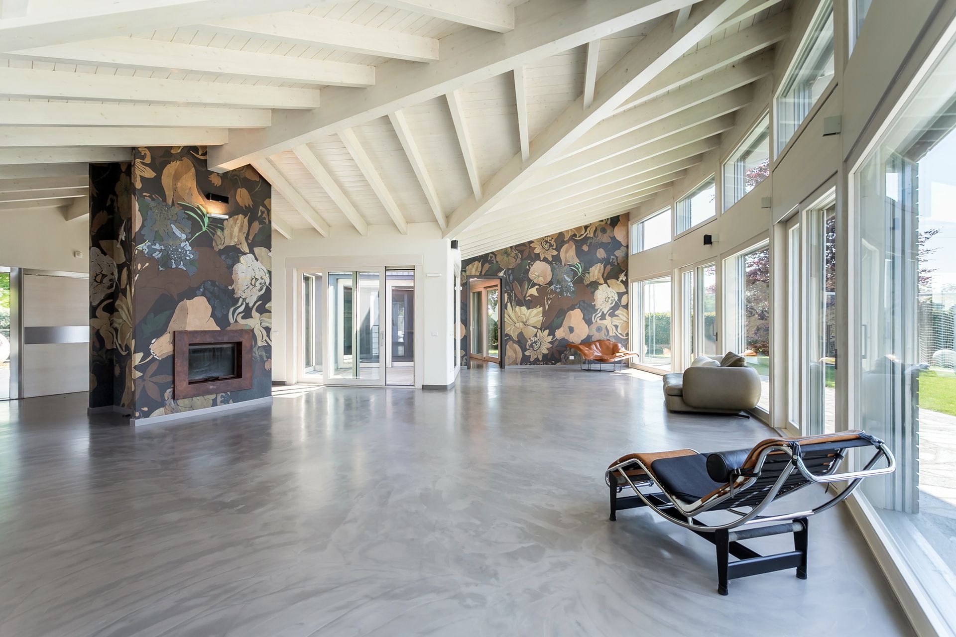 L’architettura della villa rompe gli schemi tradizionali: volumi ben distribuiti, grandi aperture vetrate e ambienti che si sviluppano su un unico piano, in perfetta connessione con l’esterno. Il cuore della casa è una zona giorno dal forte impatto scenico, con soffitti alti, travi a vista e un elegante camino che scalda l’atmosfera. L’area living si apre su un giardino curato con piscina salata riscaldata, creando un continuum tra interni ed esterni. Una cucina su misura, luminosa e funzionale, è incorniciata da una veranda abitabile che regala una vista aperta sul verde. La zona notte, ben separata, ospita camere da letto ampie e silenziose, cabine armadio e bagni con finiture di alto livello. Ogni ambiente è progettato per offrire luce naturale, privacy e accesso diretto all’esterno.