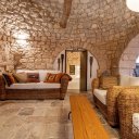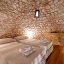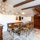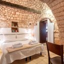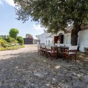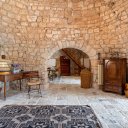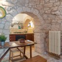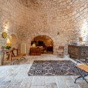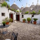 In vendita un affascinante gruppo di trulli composto da 8 coni, nel cuore della Valle d’Itria. La proprietà, oggetto di una ristrutturazione conservativa che ha preservato pavimenti in chianche originali e coni in pietra a vista, offre un’ampia zona living con soggiorno dotato di doppio ingresso, area relax con camino e sala da pranzo dalla quale, tramite una scala in legno, si accede al soppalco che ospita la prima camera da letto. Dalla zona living si raggiungono il cucinino, una seconda camera da letto con alcova al cui interno è stato ricavato un servizio, e una terza camera da letto con bagno privato, oltre a un ripostiglio attualmente utilizzato come ulteriore bagno per la zona giorno. All’esterno sono presenti un accesso pedonale tramite spiazzo comune pavimentato in chianche e un accesso carrabile dal retro, attraverso un giardino con piante ornamentali e camminamenti in pietra che conduce a un cortile privato anch’esso rifinito con chianche originali. Completano la proprietà un locale tecnico, un terreno con alberi da frutto e una superficie complessiva, tra coperto e scoperto, di circa 1.432 mq. L’immobile è dotato di cisterna collegata all’acquedotto rurale e riscaldamento autonomo con bombolone GPL interrato, rappresentando una soluzione ideale per chi desidera un’abitazione autentica immersa nella tradizione pugliese o un investimento in un contesto di grande fascino.