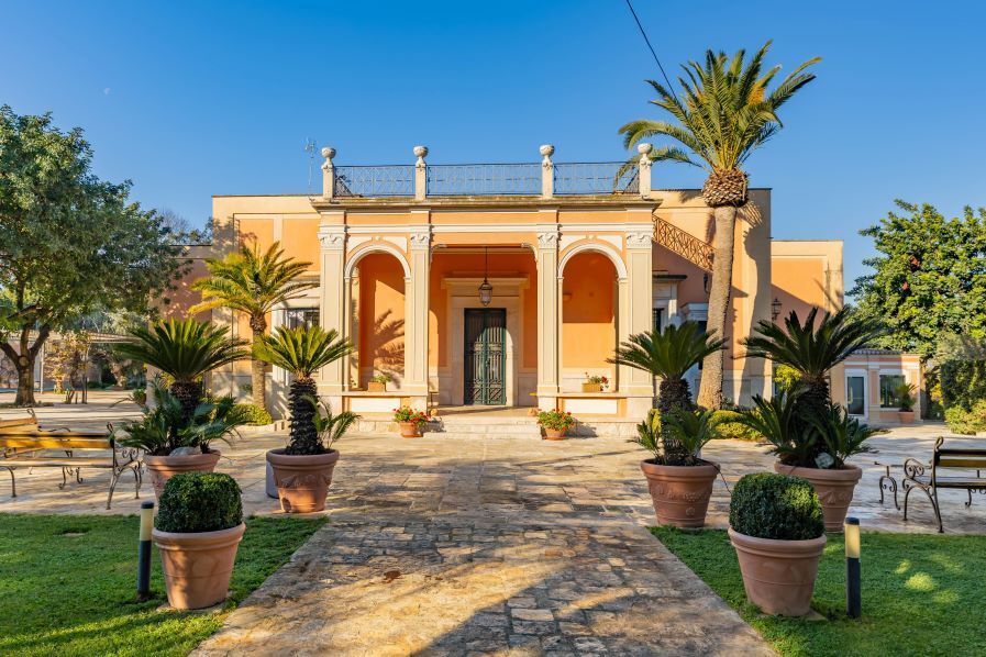 Tra le residenze storiche più affascinanti del territorio, questa villa Liberty del tardo Ottocento si presenta come una scenografia perfetta: un luogo dove l’architettura incontra la bellezza e la bellezza diventa emozione. L’ingresso monumentale, incorniciato da colonne eleganti e da un portico dalle geometrie armoniose, accoglie l’ospite con un’immediata sensazione di esclusività. La luce dorata del Sud avvolge la facciata color pesca, riscaldando ogni dettaglio e riflettendosi sul selciato antico che guida verso la dimora.
