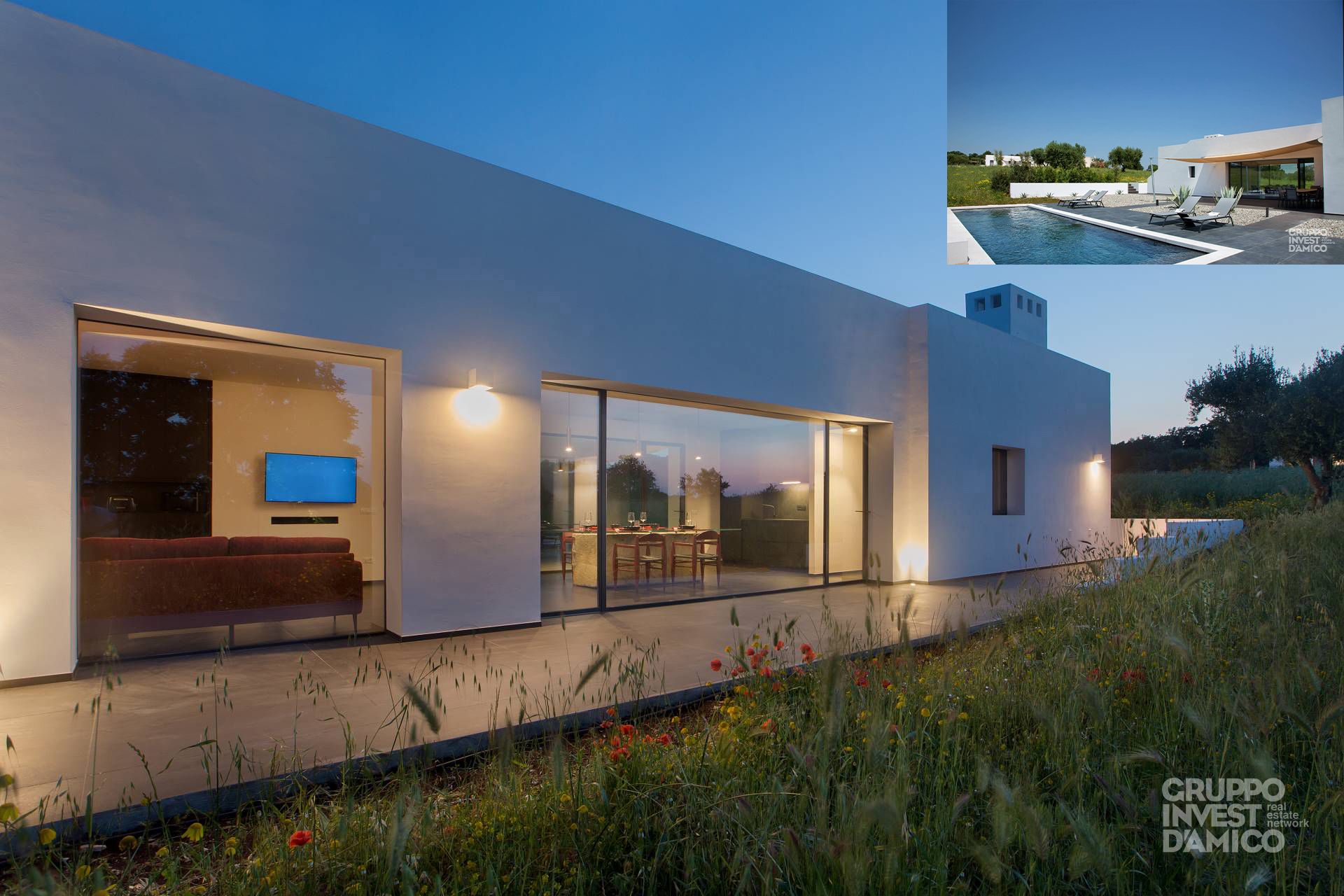 Da scala esterna in muratura si accede alsovrastante TERRAZZO panoramico, da cui si scorgono in lontananza le città di Ostuni e di Ceglie Messapica. Area esterna pertinenziale, in parte pavimentata, con due grandi agavi e unaPISCINA di circa mq.40rivestita da lastre in gres, circondata da solarium con vista su una vigna, oltre a zona barbecue-piano cottura esterno. Superficie complessiva di circa mq 12.000 con collegamento al Pozzo Artesiano ubicato nel terreno confinante. Dotata di cancello elettrico d’accesso e rifinita con materiali di pregio.