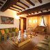 Se l’ala destra del piano terreno può maggiormente dichiarare un carattere di rappresentanza, quella sinistra mostra gli aspetti più intimi della quotidianità nella cucina, nella stanza da bagno e nella sala con camino sovrastata dai caldi travi in legno scuro.
