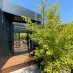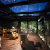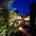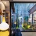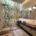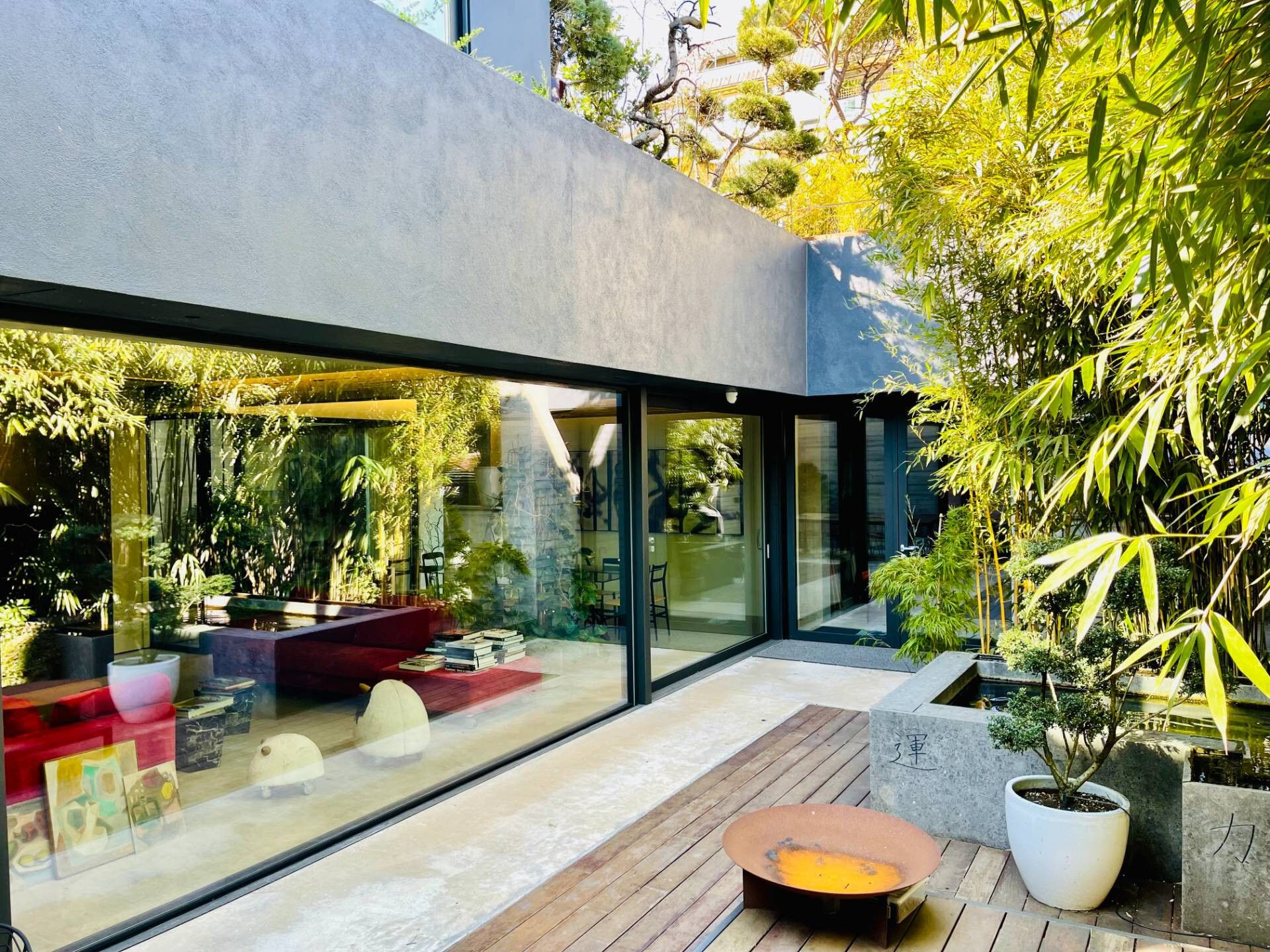 L’ingresso conduce a un affascinante living outdoor, immerso tra piante di bambù e arricchito da una vasca con carpe giapponesi, trasmettendo sin da subito un senso di armonia e benessere. Una parete in vetro separa elegantemente gli interni, mantenendo una connessione visiva costante con il verde esterno.