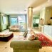 Una scenografica scala in marmo verde conduce al piano superiore, dove troviamo una terza camera da letto, un ulteriore bagno e una zona living che si affaccia su una terrazza sospesa sul giardino.